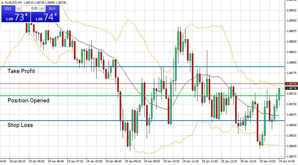 Vous ouvrez un contrat standard (Long) pour la paire de devises EUR/USD. Comme le montre le graphique, en fonction du mouvement du marché, la position sera automatiquement fermée si elle atteint le niveau du stop-loss ou de limite.